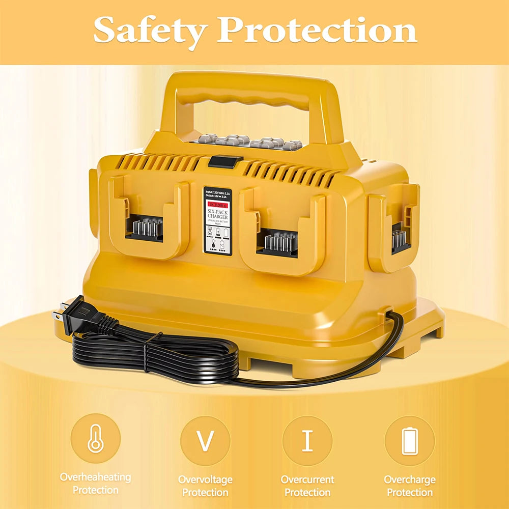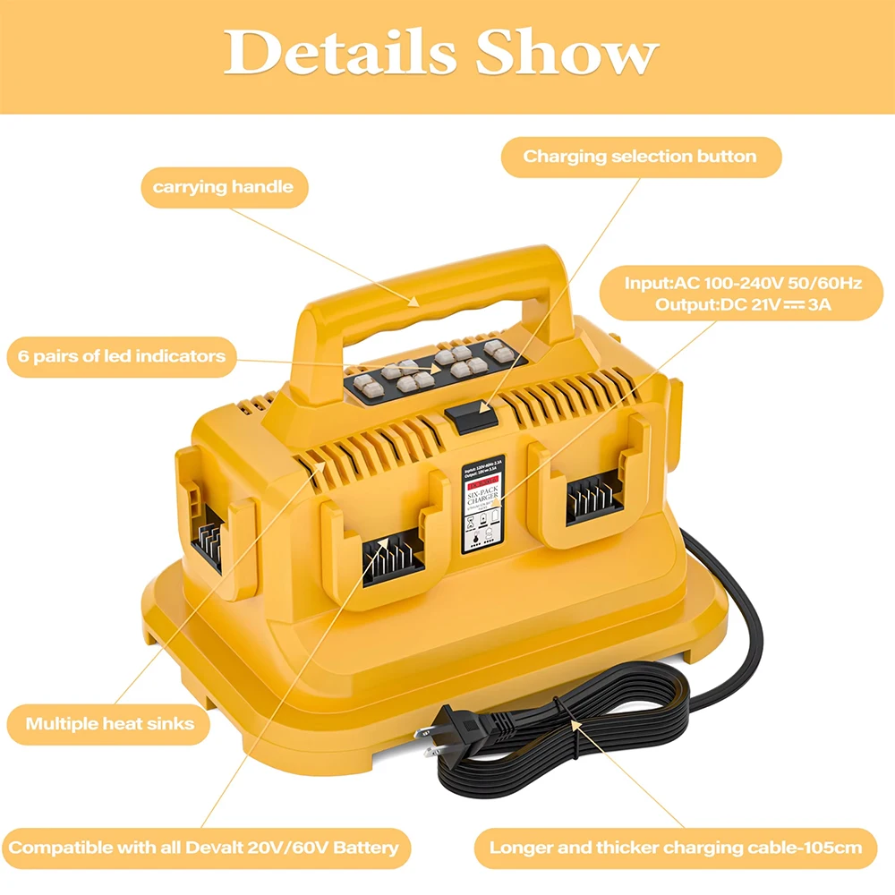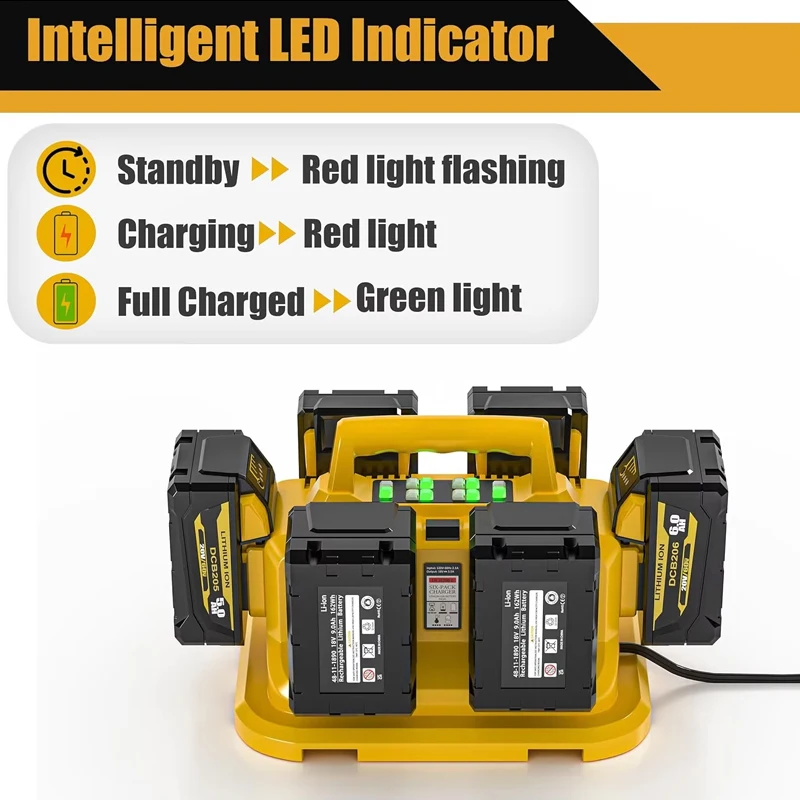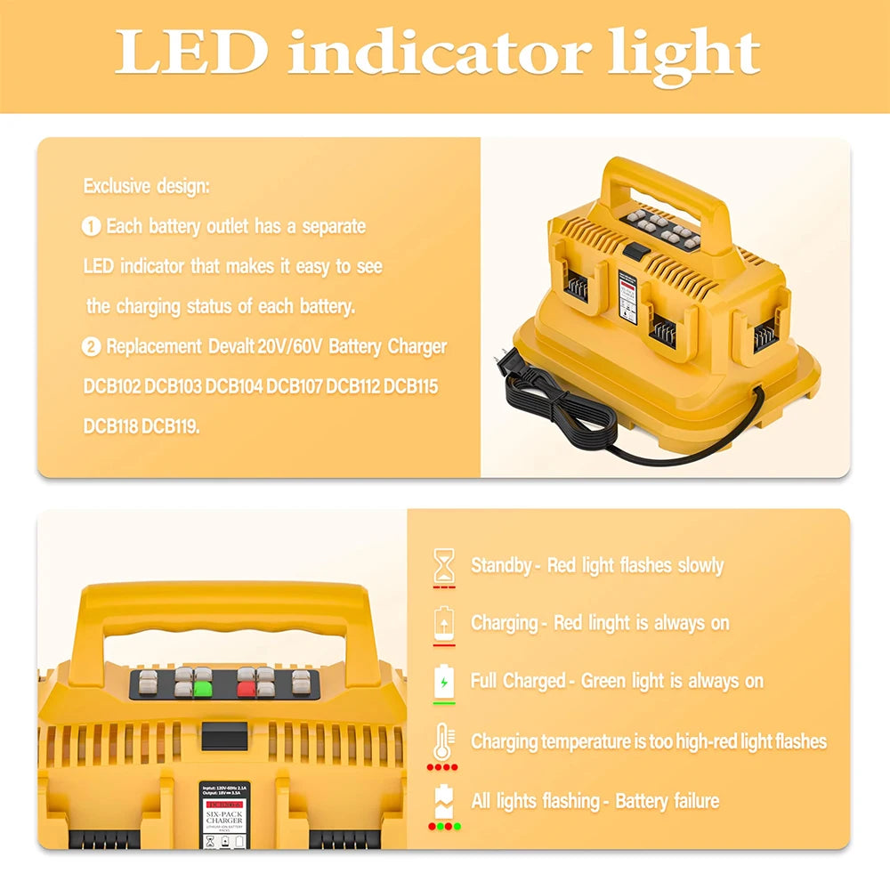 Replacement for the Dewalt battery charger is a 6-in-1 charging station.Each charging port is equipped with an LED indicator, allowing you to easily monitor the battery charging status. This charger serves as an excellent alternative to the Dewalt 20V fast chargers such as DCB102.