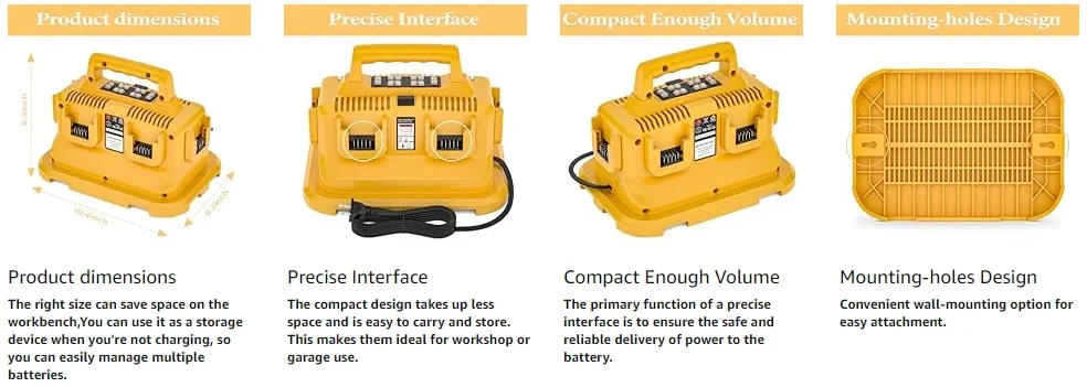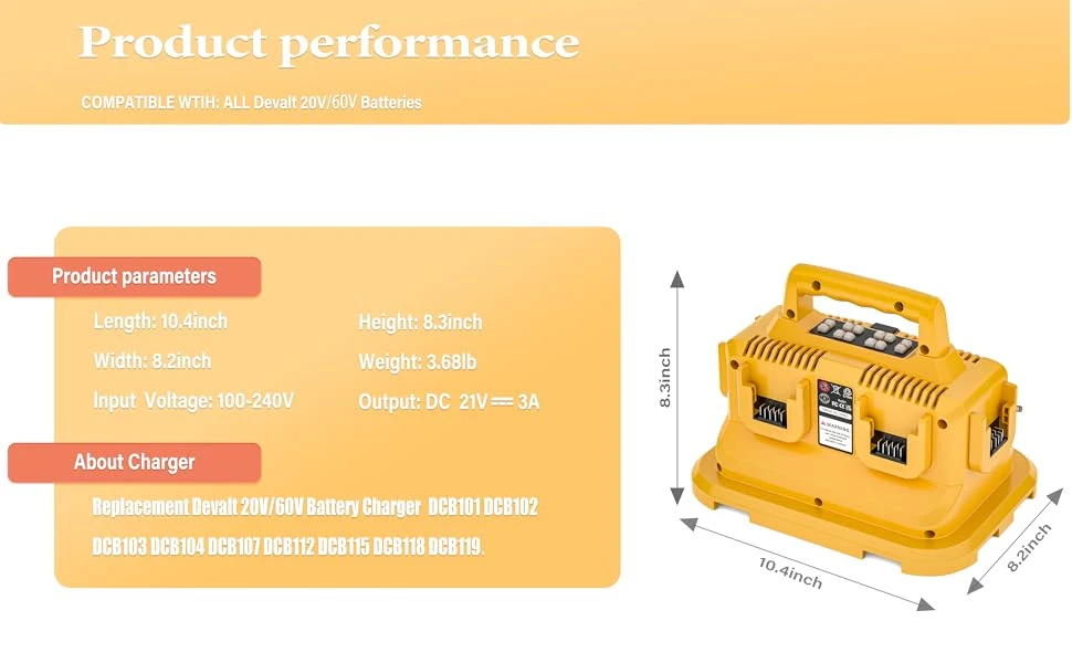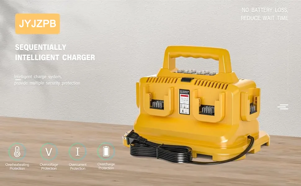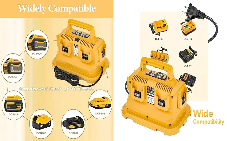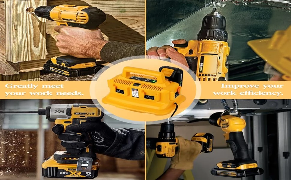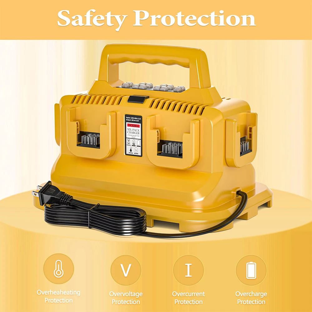 Replacement for the Dewalt battery charger is a 6-in-1 charging station.Each charging port is equipped with an LED indicator, allowing you to easily monitor the battery charging status. This charger serves as an excellent alternative to the Dewalt 20V fast chargers such as DCB102.