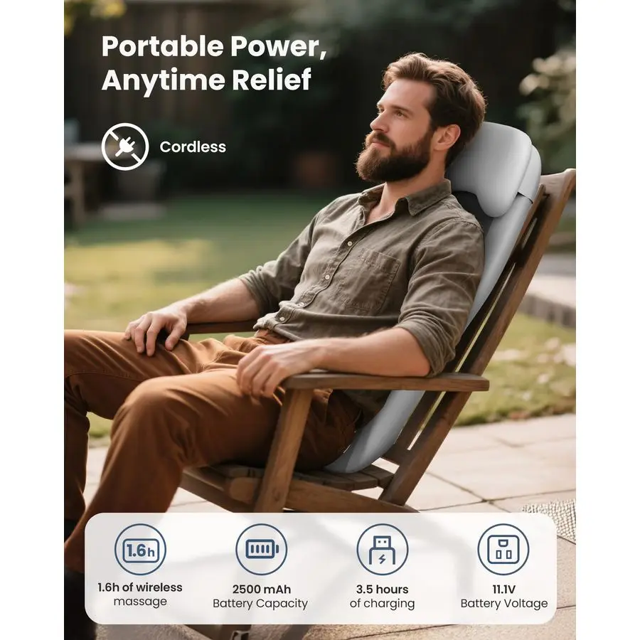 Rechargeable amp Cordless Relax AnywhereUnlike most massage cushions that must stay plugged in, cordless back massager with heat is equipped with a 2500mAh rechargeable lithium battery, giving you the freedom to enjoy a massage without being tied to a wall outlet. A full charge takes just 3.5 hours and provides up to 1.6 hours of wireless use perfect for outdoor spaces, patios, RVs, or office chairs. You can also plug it in anytime for continuous power, giving you the best of both worlds.