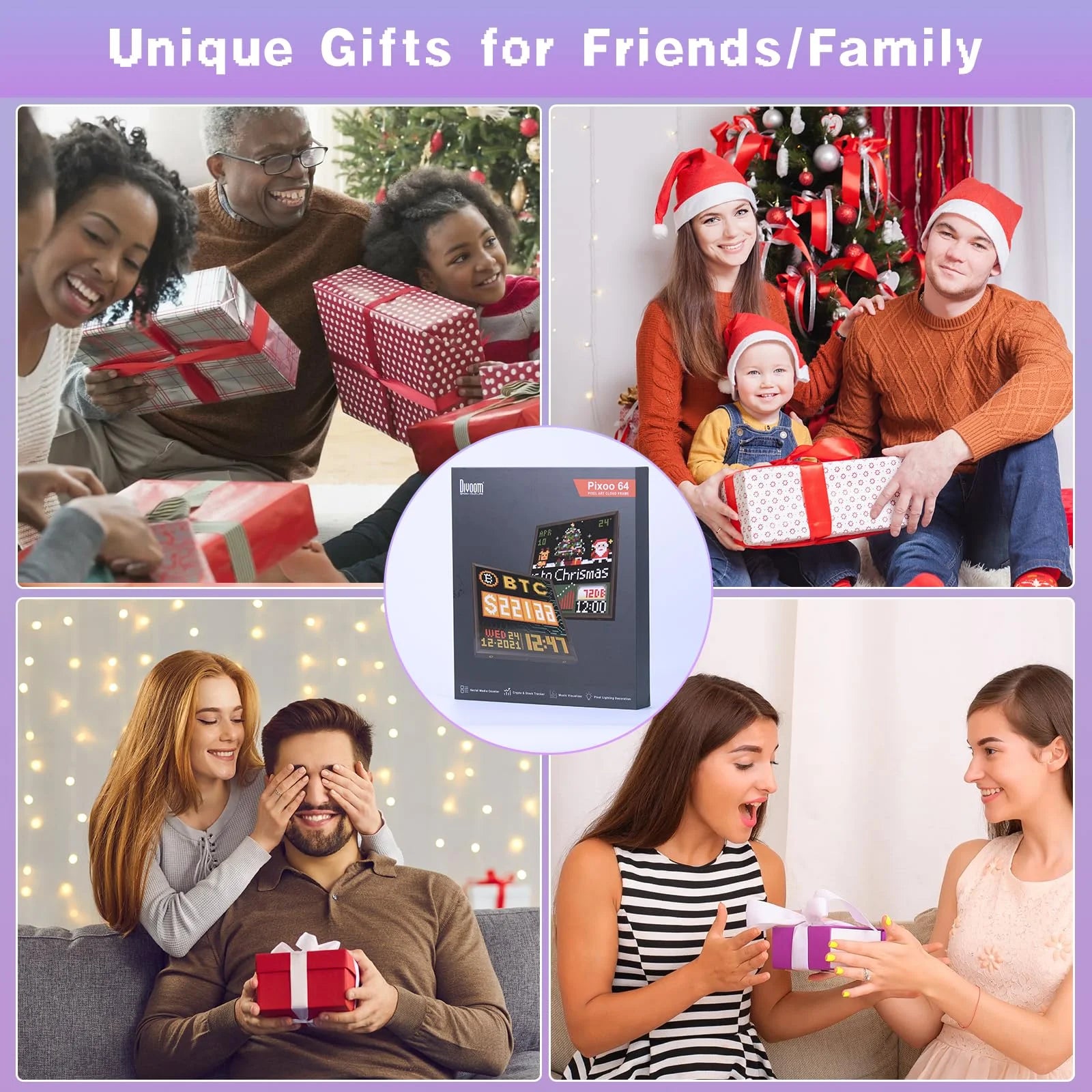 You can place the Pixoo-64 in every corner inside your house. Decorate the living room with some cartoon anime, or light up the hallway with your own pixel art exhibition; let Pixoo-64 light up your room with the pixel art animations. At the same time, Pixoo 64 is also the best choice as a holiday decoration.