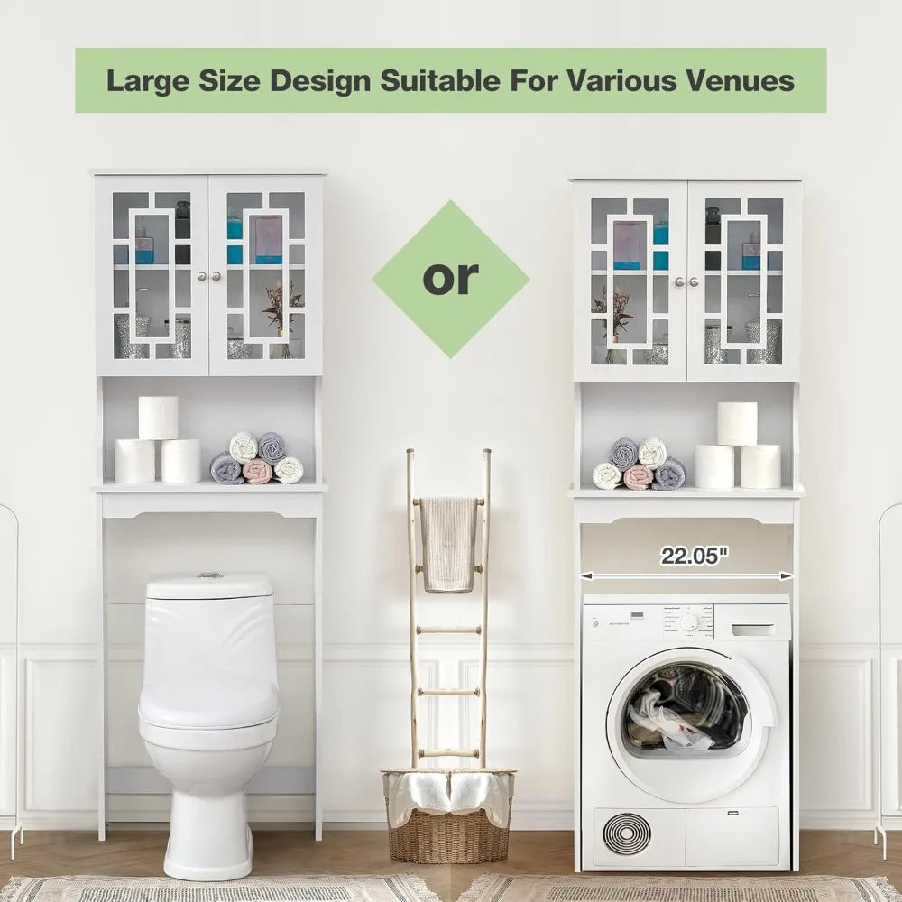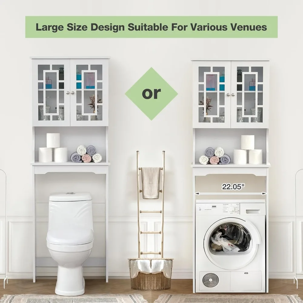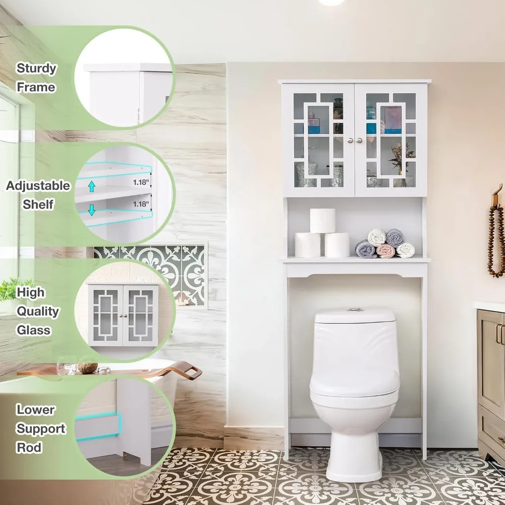 Over-the-Toilet Wooden Storage Cabinet with Adjustable Shelf and 2 Glass Doors - Space-Saving Bathroom Organizer and Home Storag