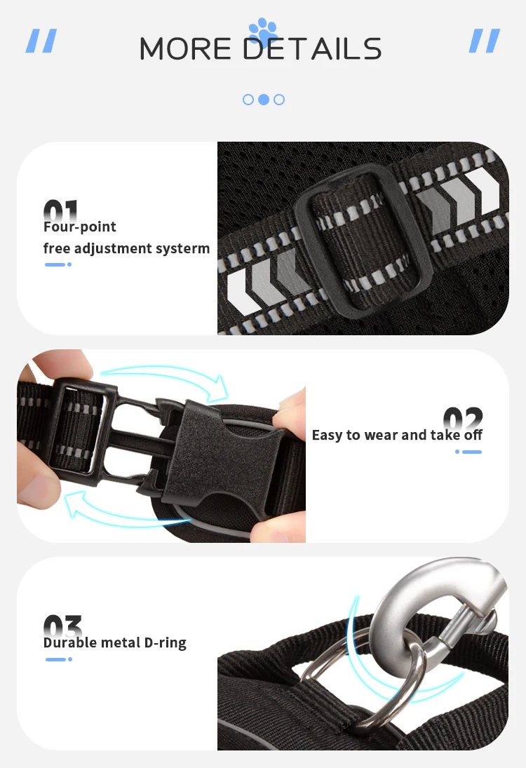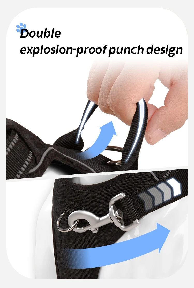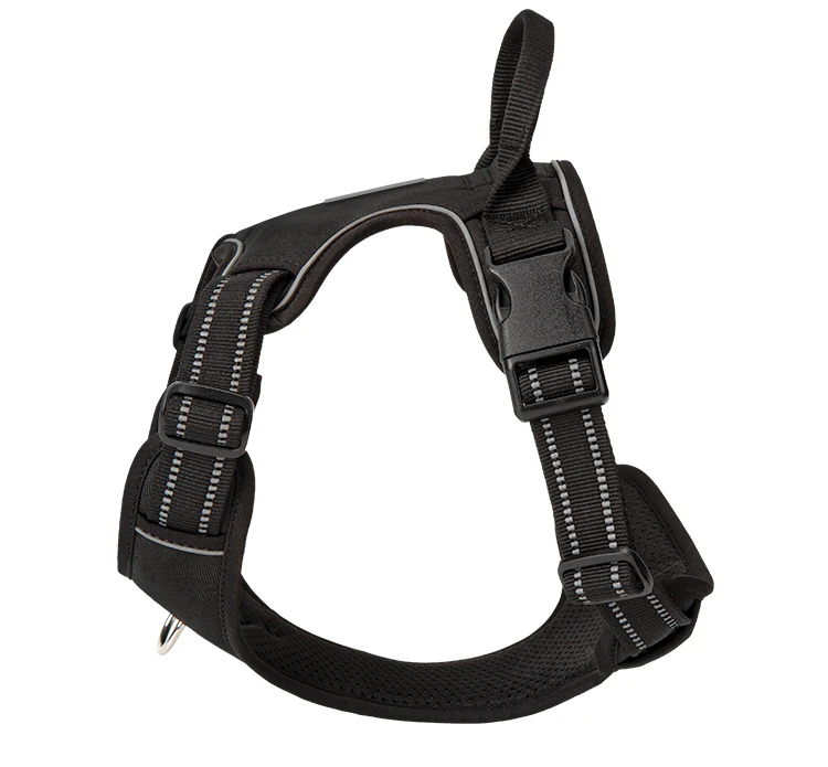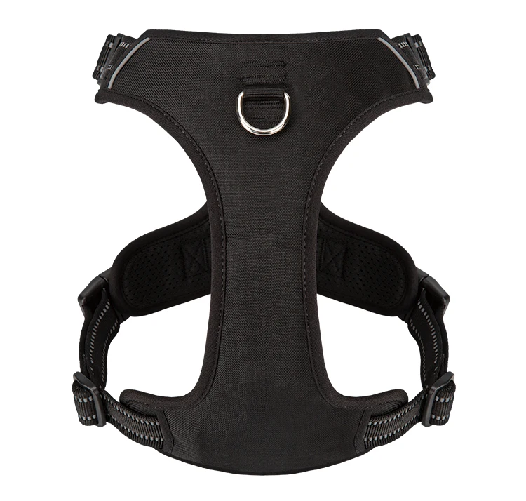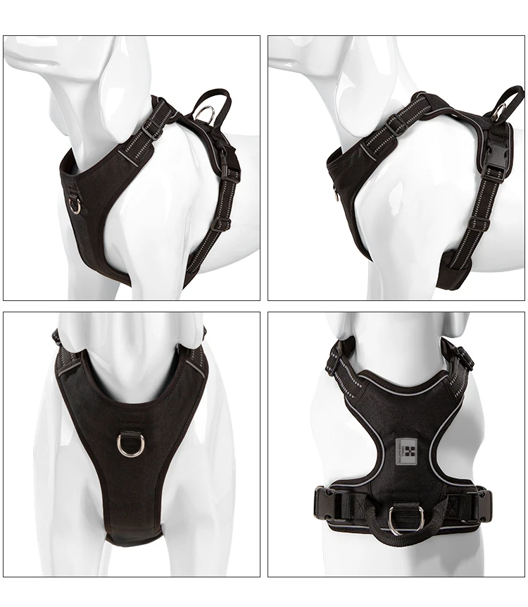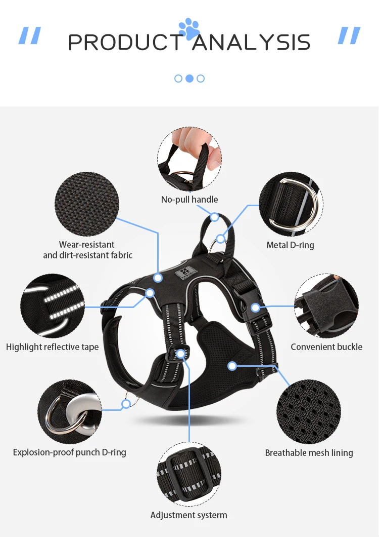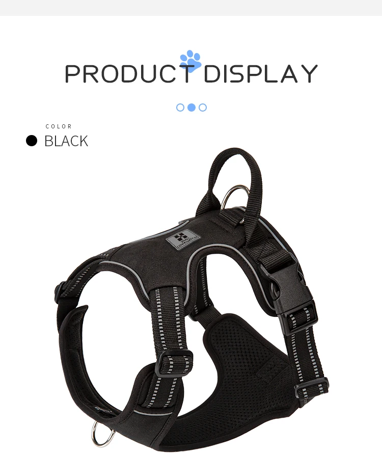 2 sturdy metal leash attachment points with reinforced webbing, front clip for discouraging pulling and back for relaxed walks. Ergonomic design, pulling pressure is evenly distributed to the body to prevent Choking.