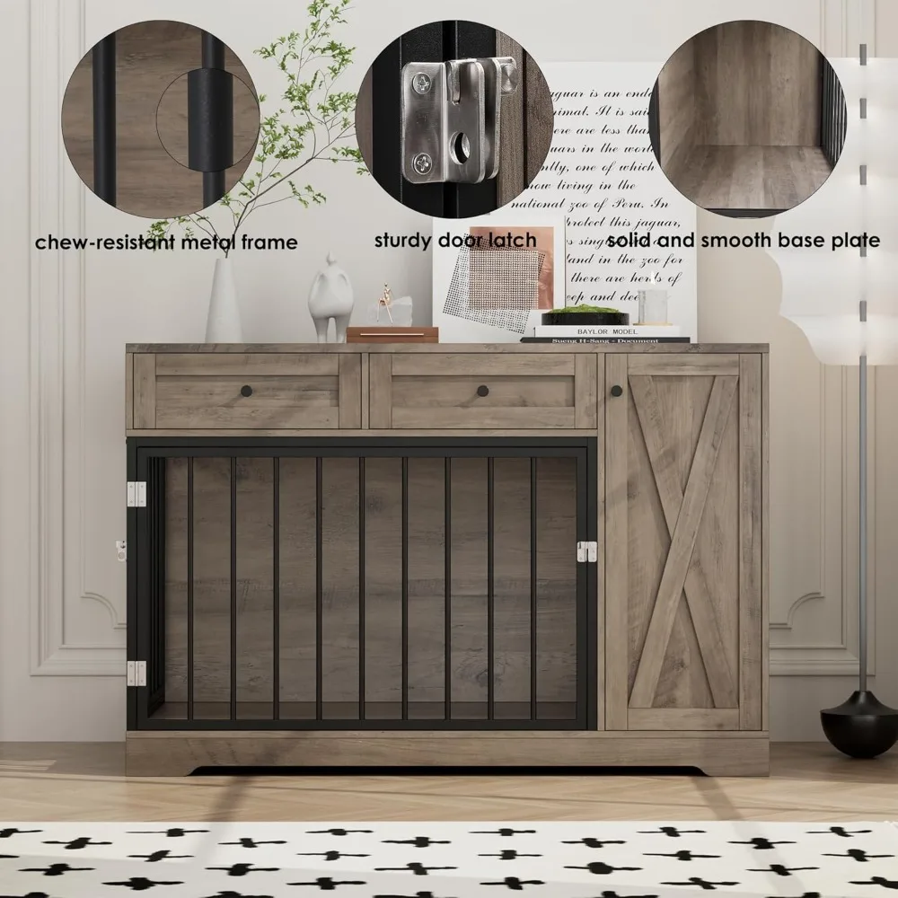 Dog cage sideboard with storage: 47”X24” massive table top allows to place some decorations. 2 drawers and a spacious cabinet with shelf provide extra storage space for pet items such as dog toys, snacks, food etc. This dog kennel sideboard with drawers is functioning furniture for owners of small and medium-sized dogs, who apart from the comfort of pets, also care about the interior design.
