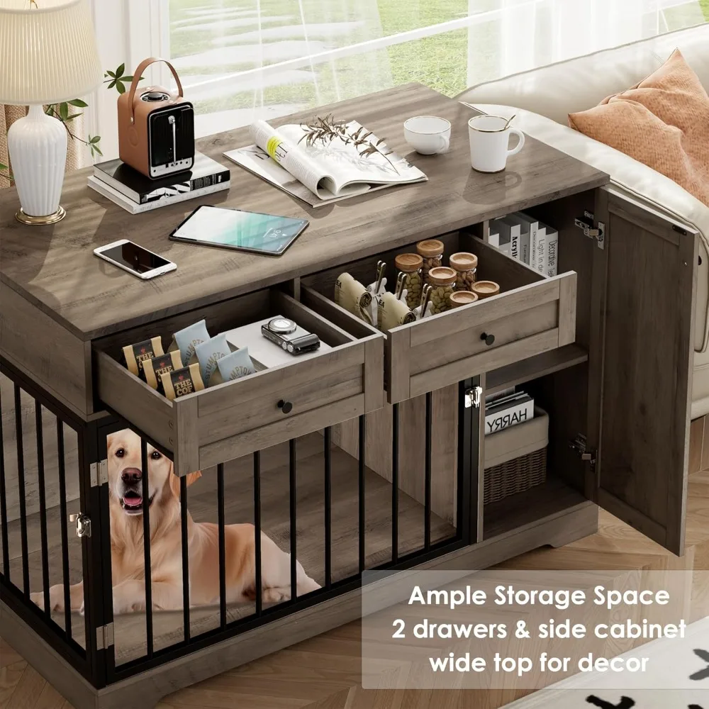 Wooden Dog Crate Furniture, Double Door Pet Kennel with 2 Drawers & Storage Cabinet, Farmhouse Style